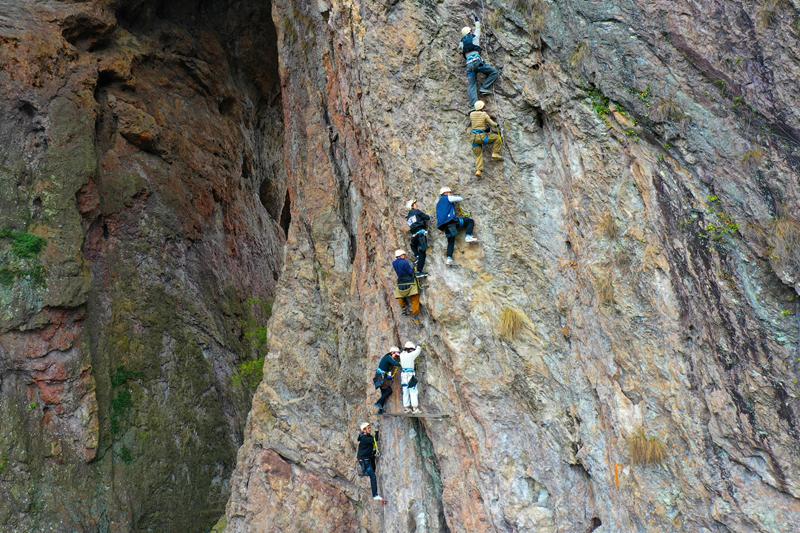 2月16日,游客在浙江省温州市雁荡山体验攀岩活动。