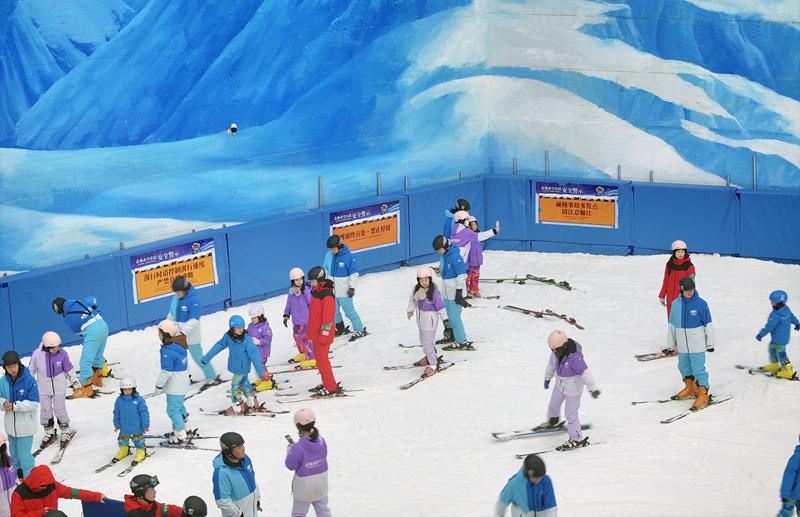 2月16日,滑雪爱好者在江苏省南通市崇川区一处室内冰雪乐园学习、体验滑雪(无人机照片)。