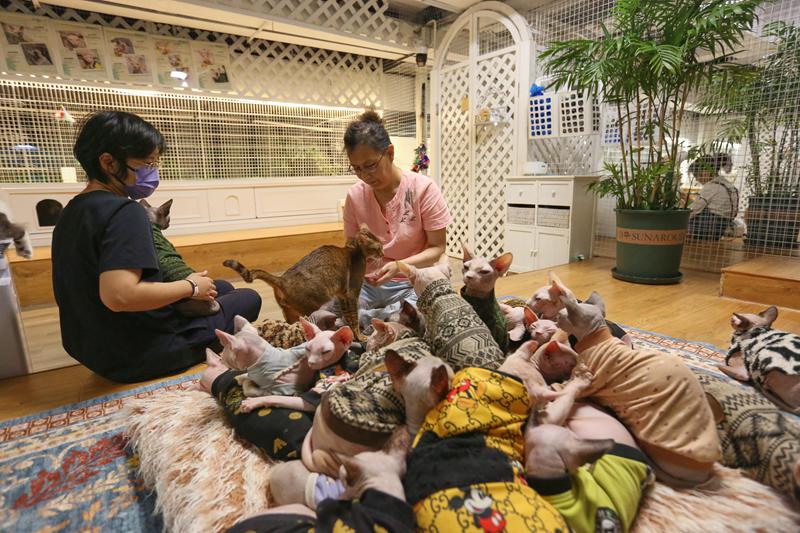 2月16日,在海南省三亚市猫猫岛萌宠乐园,消费者和猫咪互动玩耍。