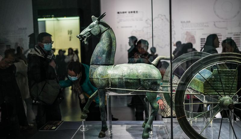 2月15日,游客乘坐沉浸式文化场景体验的西安城市观光巴士,与工作人员扮演的历史人物进行互动。