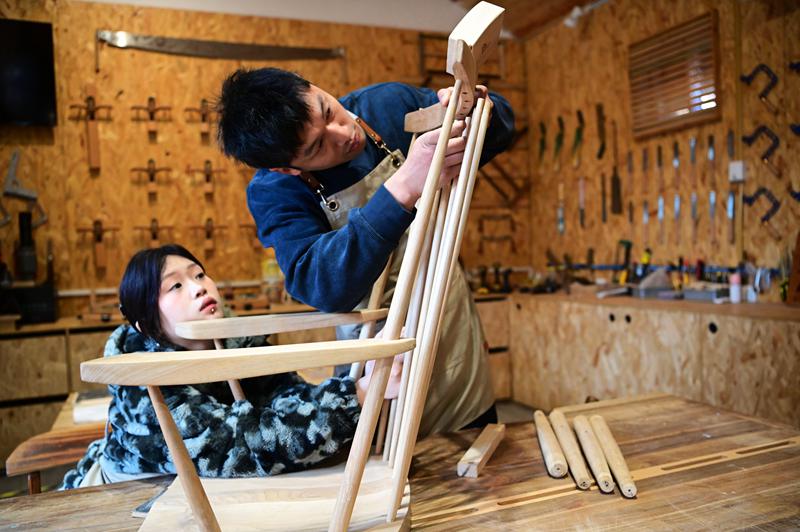 2月16日,在山东省聊城市东昌府区墩木工坊,郭正章(右)、焦冬妍共同制作摇椅。他们利用春节假期学习木工技艺。