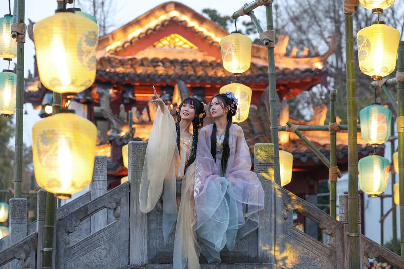 2月13日,两名穿着传统服饰的游客在湖北省襄阳市米公祠景区新春游园会游玩。