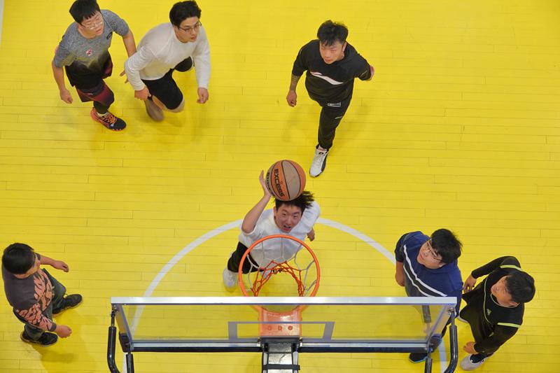 2月16日,市民在山东省烟台市一体育馆打篮球。