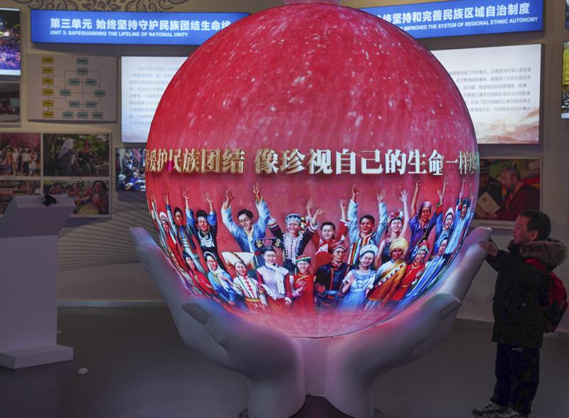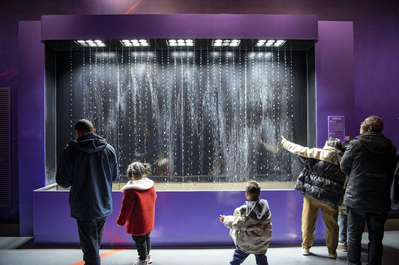 2月16日,人们在浙江省金华市金华之光科技馆体验“视觉水帘”科普项目。