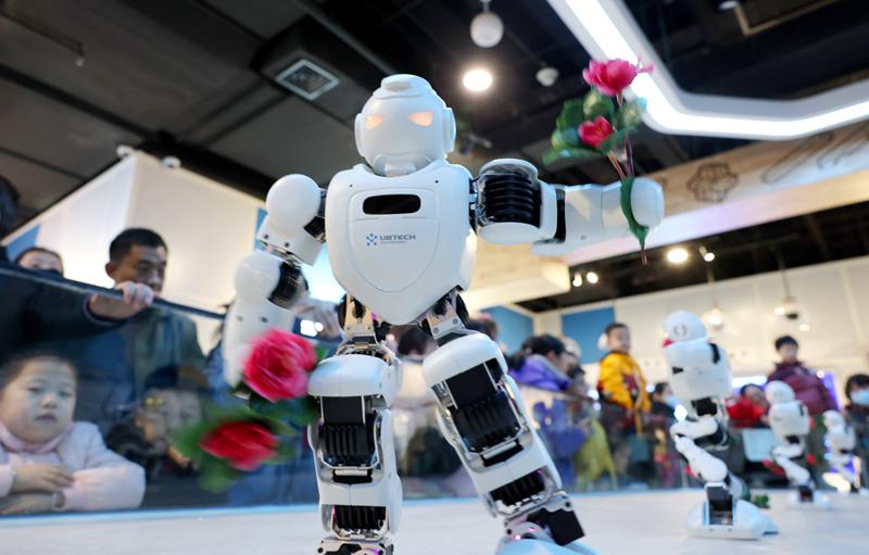 2月16日,人们在山东省枣庄市科技馆观看机器人跳舞表演。