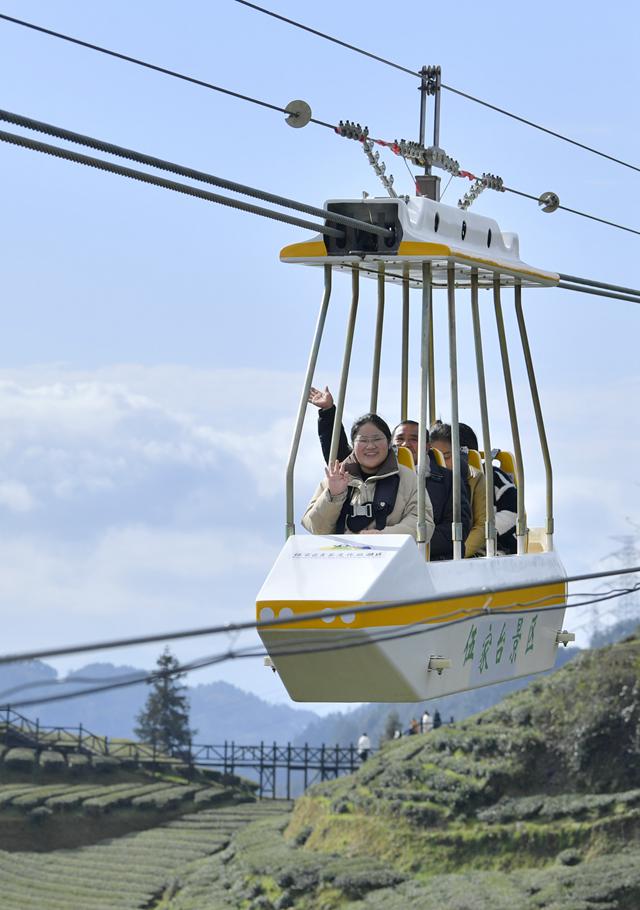 2月16日,游客在湖北省宣恩县万寨乡伍家台村的有机茶园上空体验“茶园飞艇”。