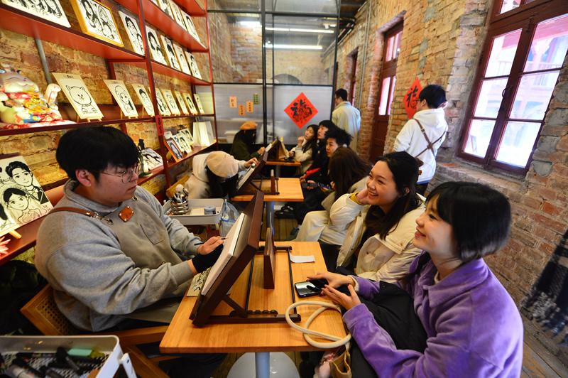 2月16日,在山东省青岛市市南区银鱼巷,一群年轻人在绘制自己的新年肖像画。