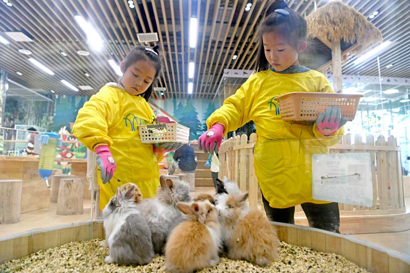 2月16日,小朋友在安徽省淮南市一家商场内的动物园为小兔子喂食。
