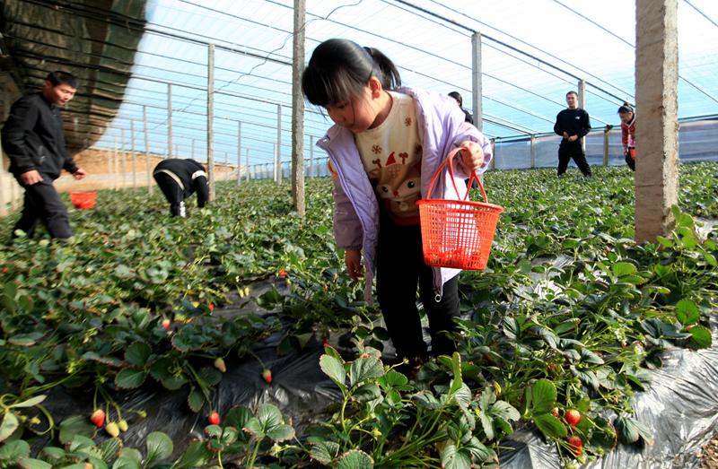 2月15日,游客在山东省临沂市平邑县温水镇花园村大棚草莓园体验田园采摘乐趣。