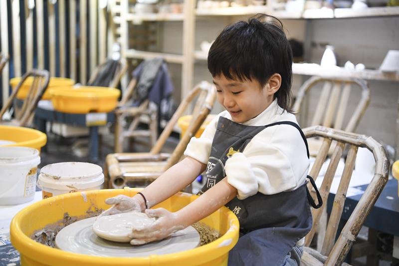 2月15日,小朋友在重庆市江北区北仓文创街区体验陶艺。