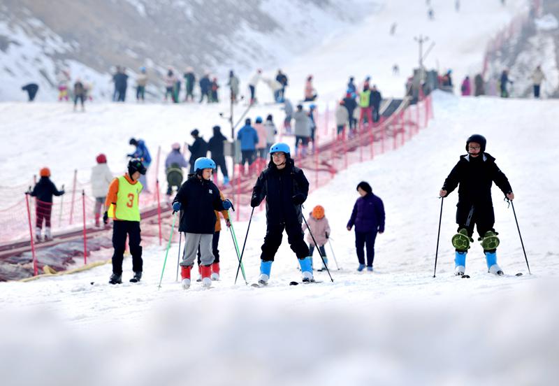 2月14日,滑雪爱好者在河北省石家庄市元氏县无极山滑雪场滑雪。