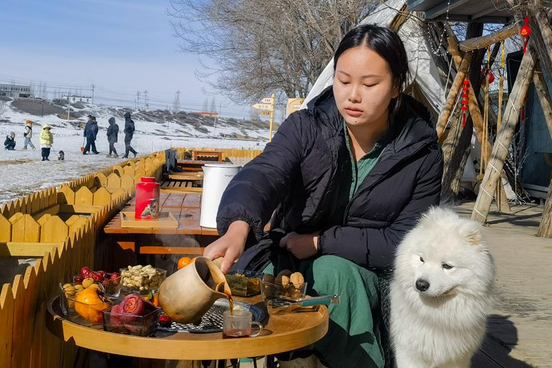 2月14日,游客在新疆乌鲁木齐县永丰镇上寺村阡陌乡宿营地体验围炉下午茶。