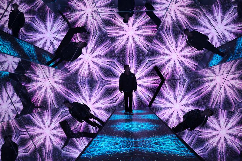 2月16日,游客在安徽省科技馆体验光影隧道。