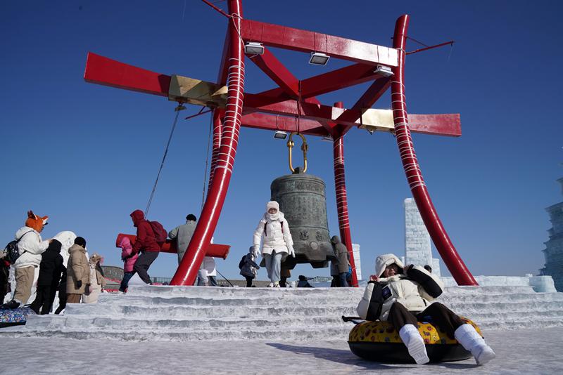 2月15日,游客在哈尔滨冰雪大世界园区游玩。
