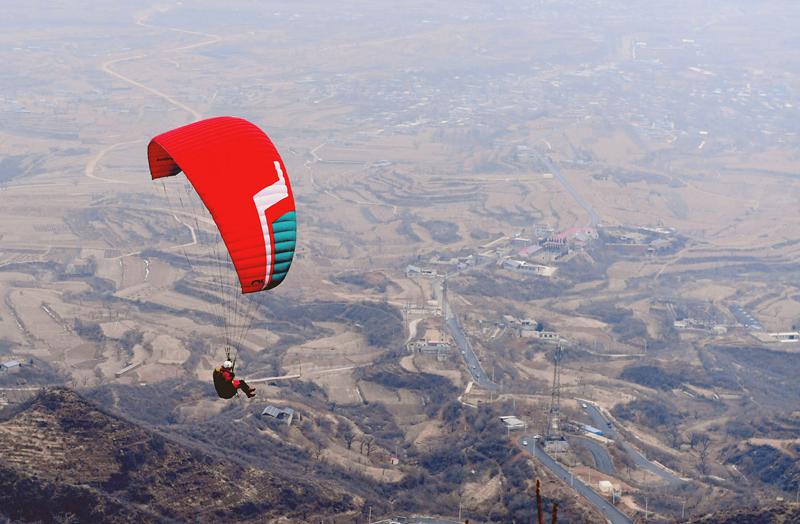 2月14日,在河北省石家庄市元氏县铁过门滑翔伞飞行营地,滑翔伞爱好者飞行在空中。