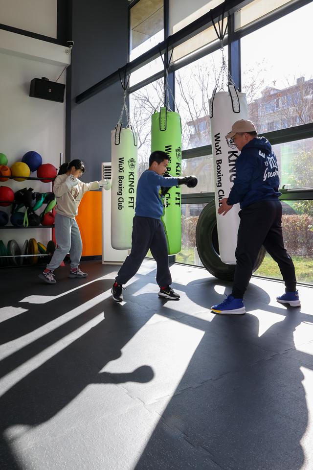 2月16日,拳击爱好者在江苏省无锡市一拳击健身俱乐部练习拳击动作。