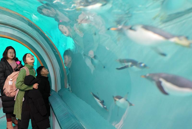 2月13日,游客在哈尔滨极地公园企鹅馆观看企鹅游泳。