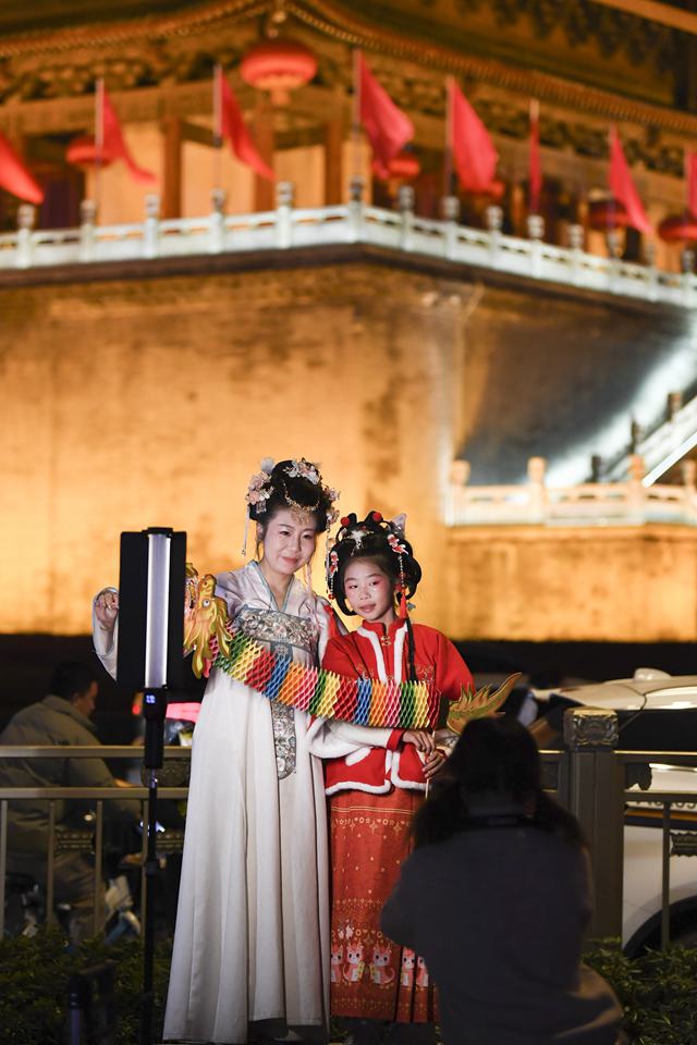2月13日,游客身穿汉服在西安市钟楼景区“打卡”留影。