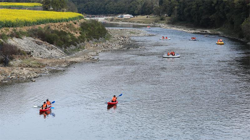 2月15日,游客在云南省腾冲市龙川江曲石镇迴水湾江段体验皮划艇漂流。