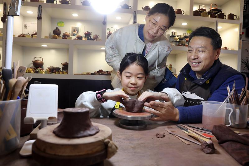 2月16日,游客在江苏宜兴蜀山老街的一家DIY紫砂陶艺体验馆制作紫砂小雕塑。