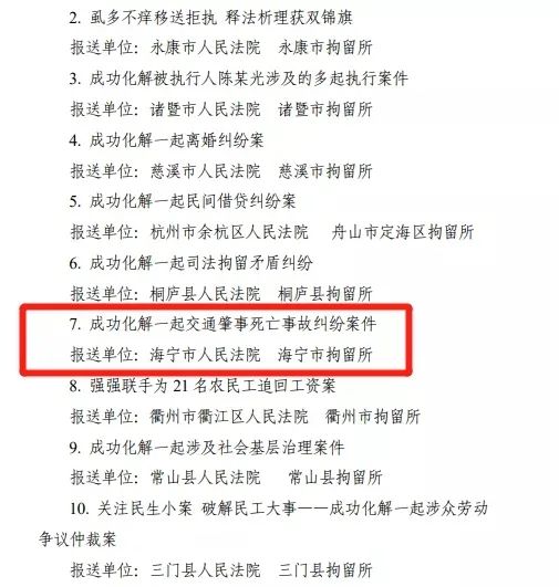 日前,在省高院、省公安厅联合组织开展的第四届全省司法拘留社会矛盾化解优秀案例评选活动中,海宁法院与海宁市拘留所报送的《成功化解一起交通肇事死亡事故纠纷案件》获评优秀案例。