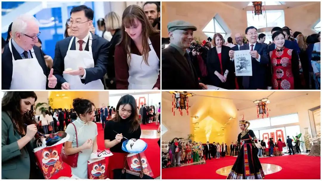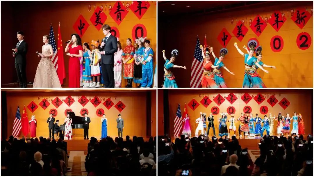 联欢活动上,中美学生献上精彩纷呈的文艺演出,庆祝即将到来的农历龙年新春。活动现场,中美青年代表还参加文化游园活动,参与中美青少年画展、汉服展示、水印版画等文化活动,感受热闹喜庆的春节庙会。