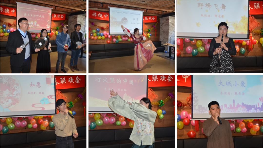 联欢会上,精彩纷呈的文艺节目接连登场:舞蹈《红马》演绎出江南水乡之美,歌曲《灯火里的中国》唱出对祖国的美好祝愿,单簧管演奏《茉莉花》《野蜂飞舞》展现东西方文化的碰撞,相声《捷克生活听我说》呈现有声有色的留学生活,歌曲串烧《大城小爱》《如愿》汇聚了大家对祖国的爱。
