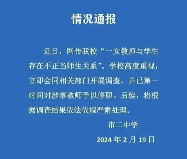 19日下午,上海市第二中学发布相关情况通报:近日,网传我校“一女教师与学生存在不正当师生关系”。学校高度重视,立即会同相关部门开展调查,并已第一时间对涉事教师予以停职。后续,将根据调查结果依法依规严肃处理。