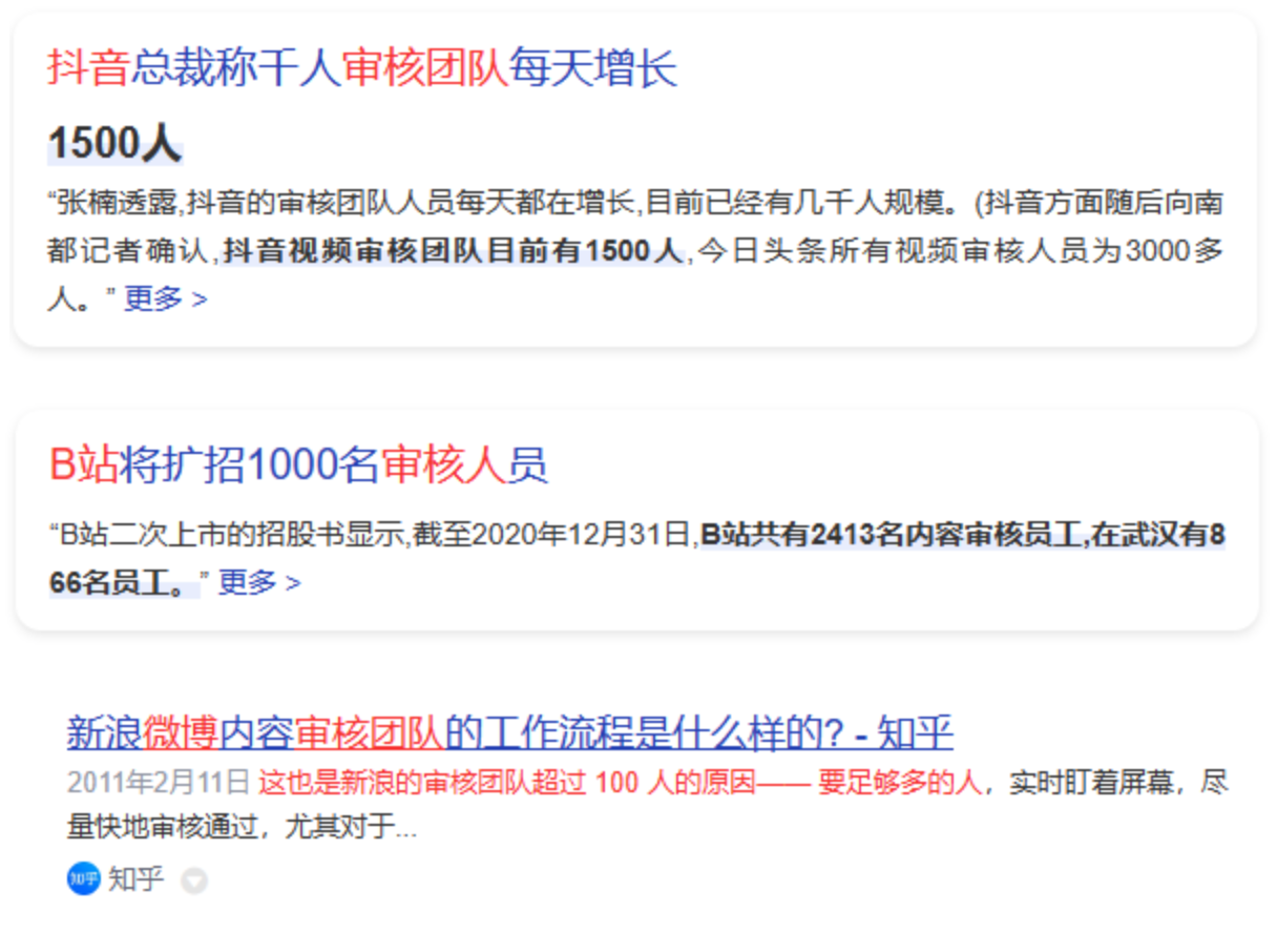 因此体量较大的产品,其审核团队以及风险管理措施也便越多,像是微博、B站、微博等大体量平台,审核团队的规模都是非常可观的。