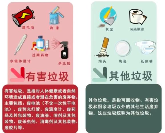 有害垃圾:会对人体健康或自然环境造成直接或潜在危害,分类投放后将交由专业的处置单位进行无害化处理。日常生活中常见的有害垃圾并不多,记住口诀:“汞灯药(汞、灯、药)池漆(池、漆)”。