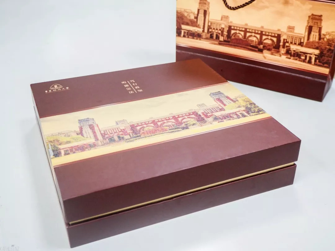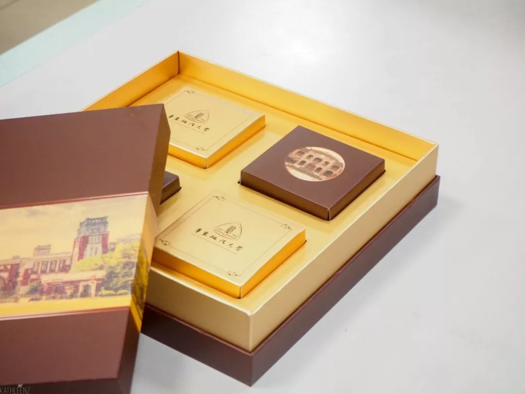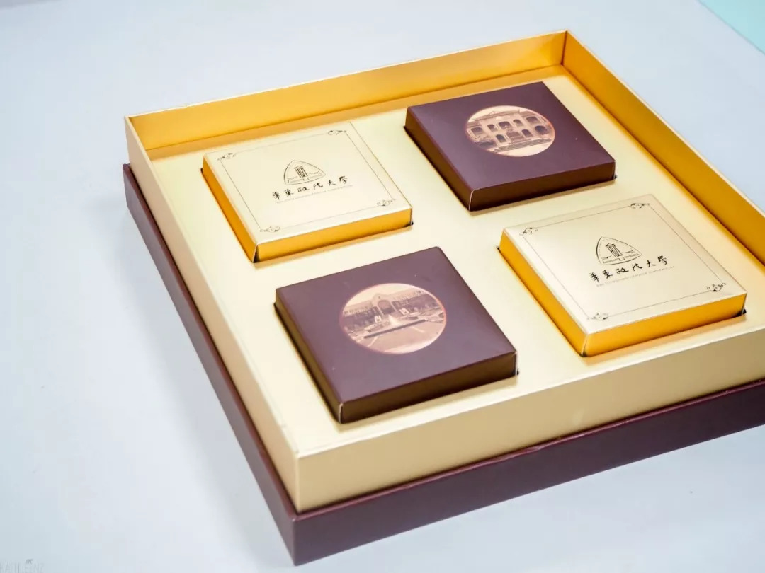 此外,月饼还有礼盒装哦~“风华政茂”月饼礼盒以长宁、松江两校区经典建筑配合华政标准色构思设计制作,精美又富有意义。礼盒售价45元/盒。