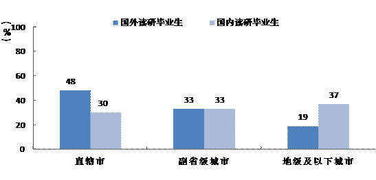中国与全球化智库(CCG)研究编写,社会科学文献出版社出版的国际人才蓝皮书《中国留学发展报告(2015)指出,留学人员回国现象逐年明显,约六成国外读研毕业生三年后已回国,回国后近五成居住于直辖市。回国的就业毕业生三年后的主要去向是工作、读研以及自主创业,其中自主创业的比例明显高于国内读研毕业生。就业的毕业生多就职于具有国际化特点及规模较大的企业。与国内读研毕业生相比,国外读研毕业生的就业质量更高。