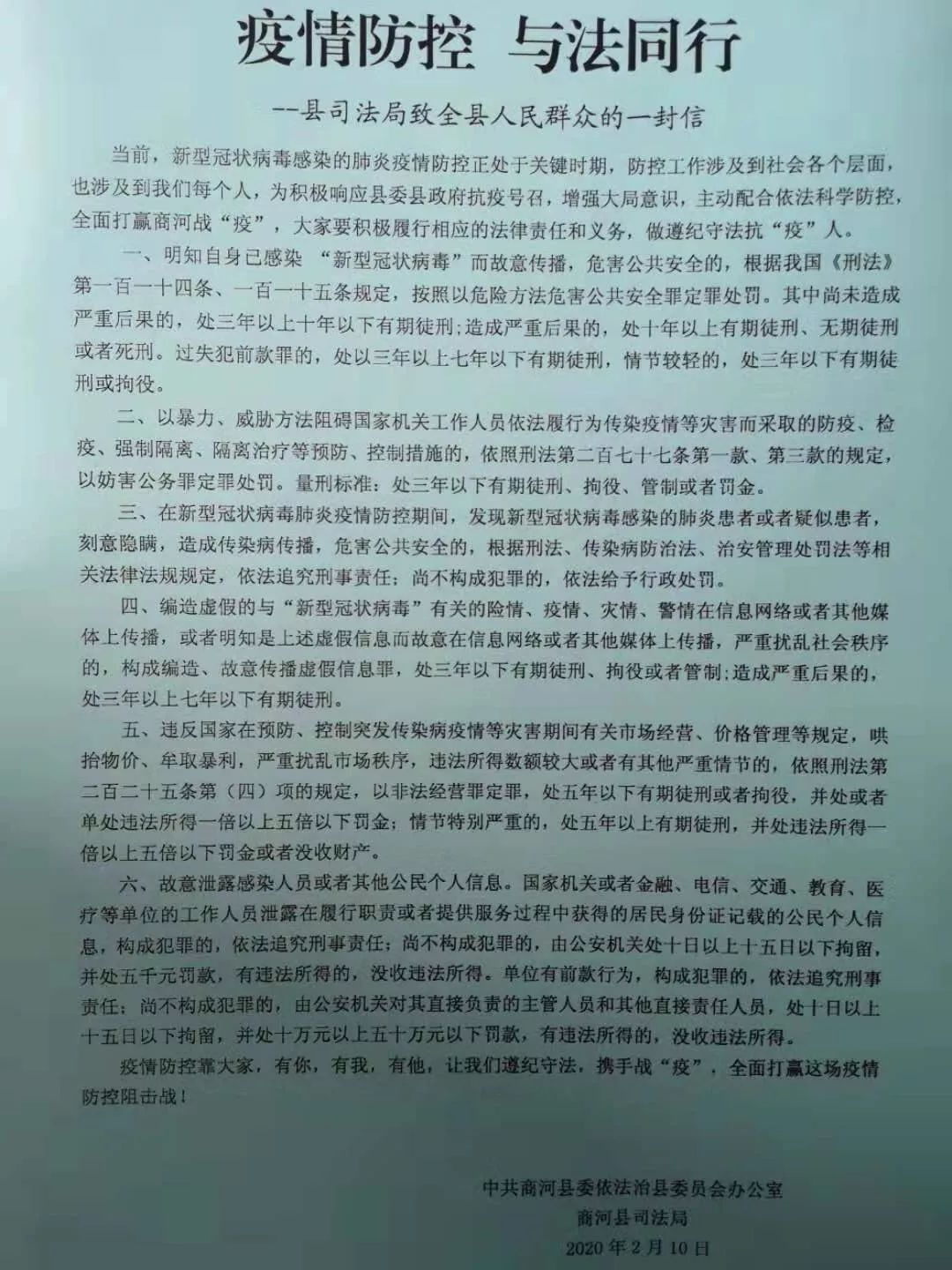 编写普法一封信,劝导人人要守法。根据当前疫情防控工作中经常出现的违法犯罪现象,编印《抗击疫情 与法同行——县司法局致全县人民群众的一封信》,在全县下发并进行张贴,劝导广大群众心存戒尺,尊法守法。