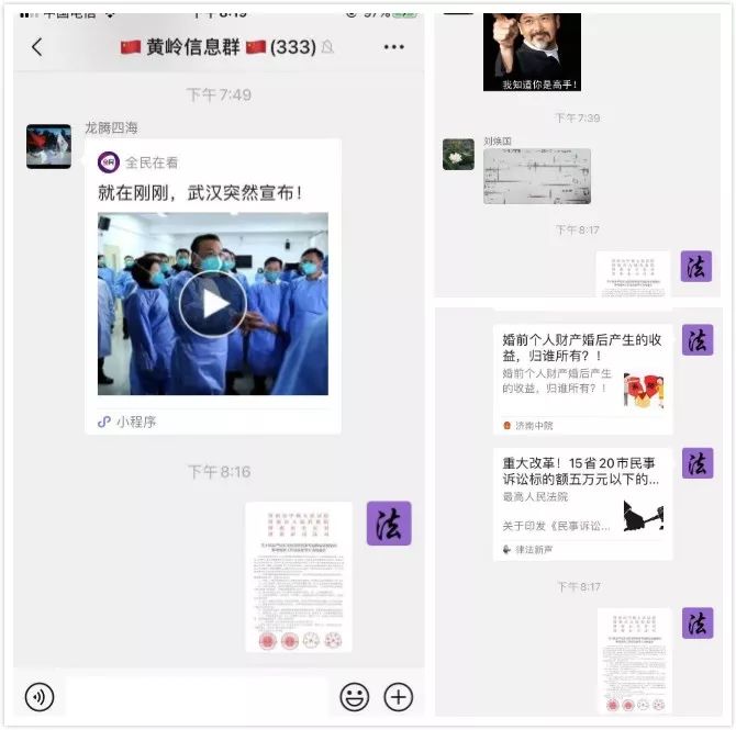 依靠普法新媒体,法治快餐送到家。充分运用微信、今日头条、《法治之声》等新媒体平台,推送权威渠道发布的公告、通知、疫情防控知识和本系统疫情防控信息。同时,动员村居律师顾问利用服务村居微信群,实行24小时不关机法律服务和宣传咨询活动,在线解读疫情防控法律法规、政策措施,为广大群众送上“法治快餐”。