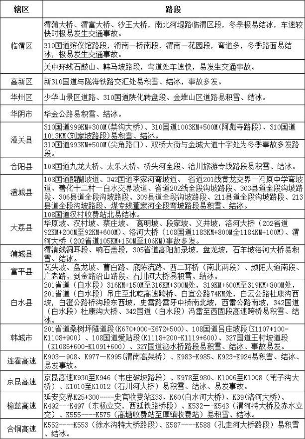 高速公路:连霍高速、京昆高速公路渭南辖区段车流量将明显增加,可能持续出现交通拥堵。因车流量大、急停变道行为多发,极易发生追尾交通事故。