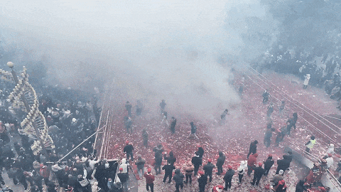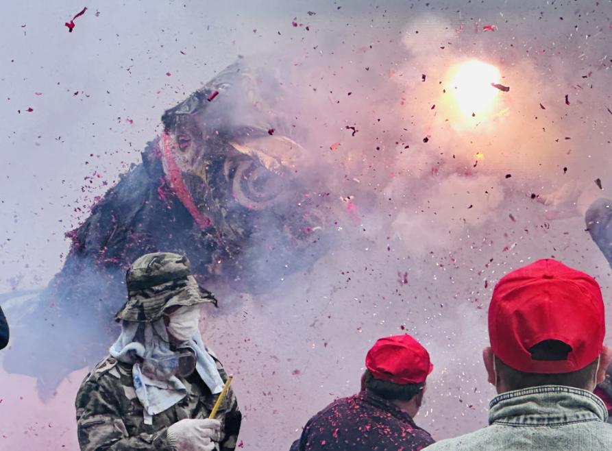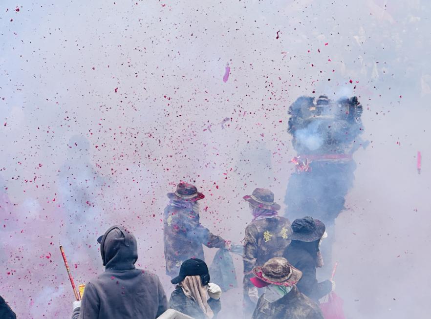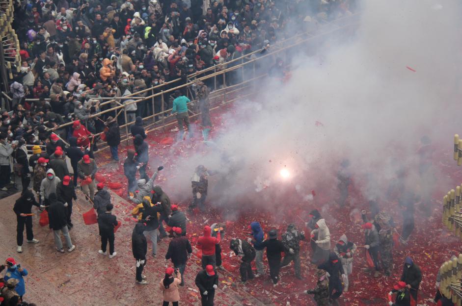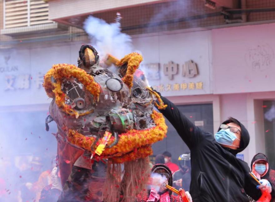 人们点燃串串爆竹投向“狮子”,
