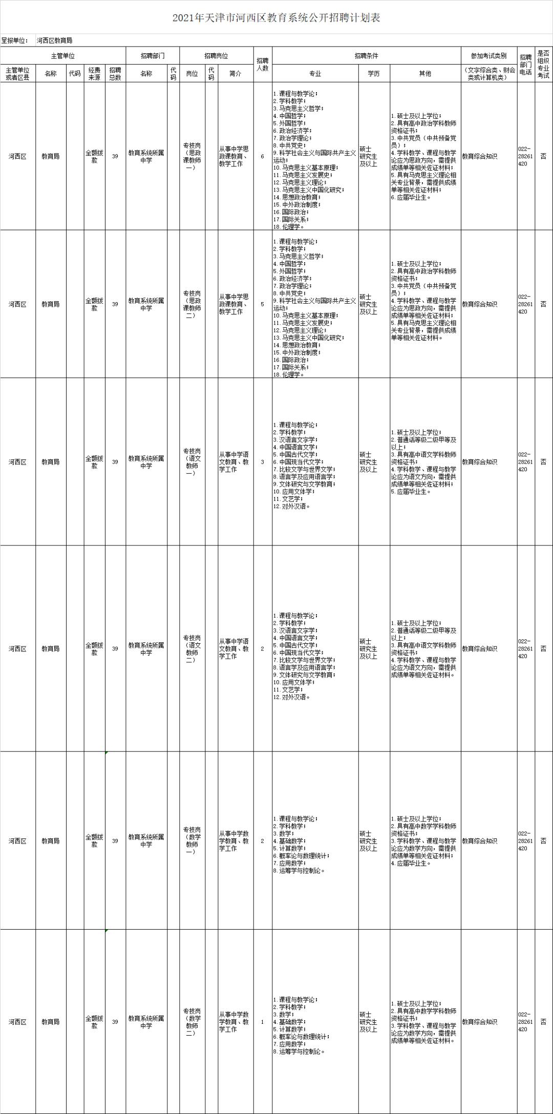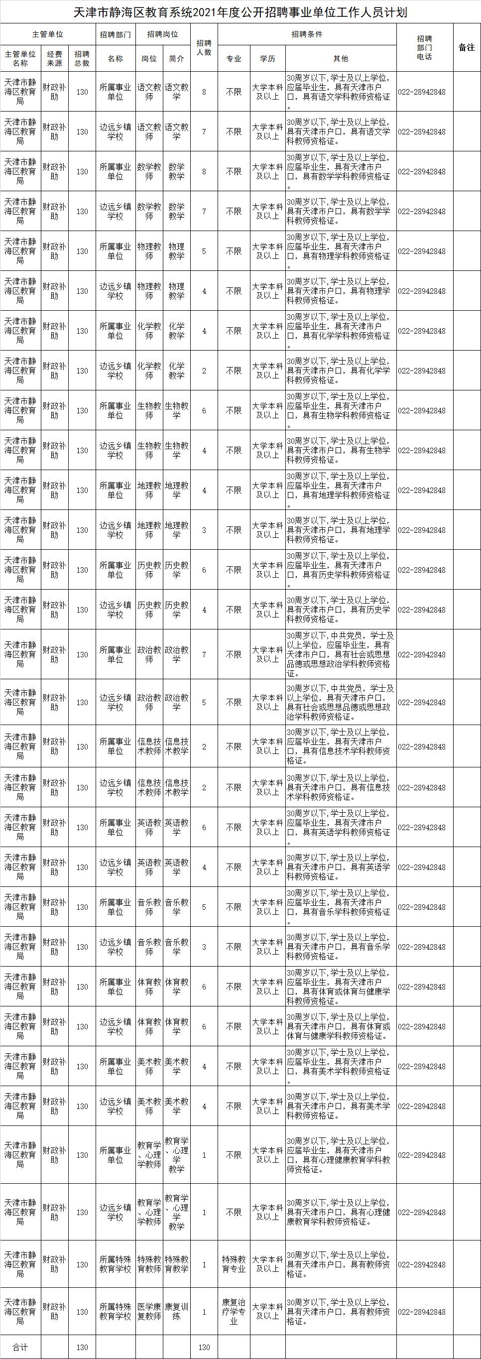 (三)具体招聘的岗位、人数和条件详见《天津市静海区教育系统2021年度公开招聘事业单位工作人员计划》。