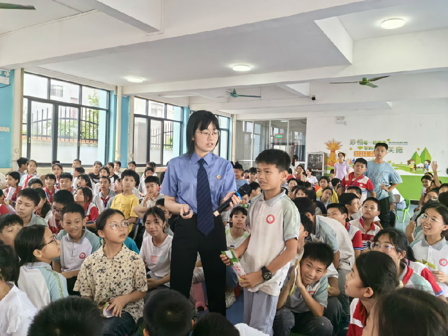活动中,检察干警结合未成年人身心特点,从孩子的角度讲述了未成年人保护法、预防未成年人犯罪法等法律知识,针对预防性侵害、预防电信诈骗校园欺凌防范等方面进行专题互动问答,引导学生们学会用法律武器保护自己,做一名学法、知法、守法、用法的新时代好少年,用法律维护自己的合法权益,有效保护自己。同时,检察干警给孩子们赠送了未成年人相关的法治宣传资料、法治学习文具礼包等,进一步提高孩子们的法治意识,切实增强孩子的自护能力。