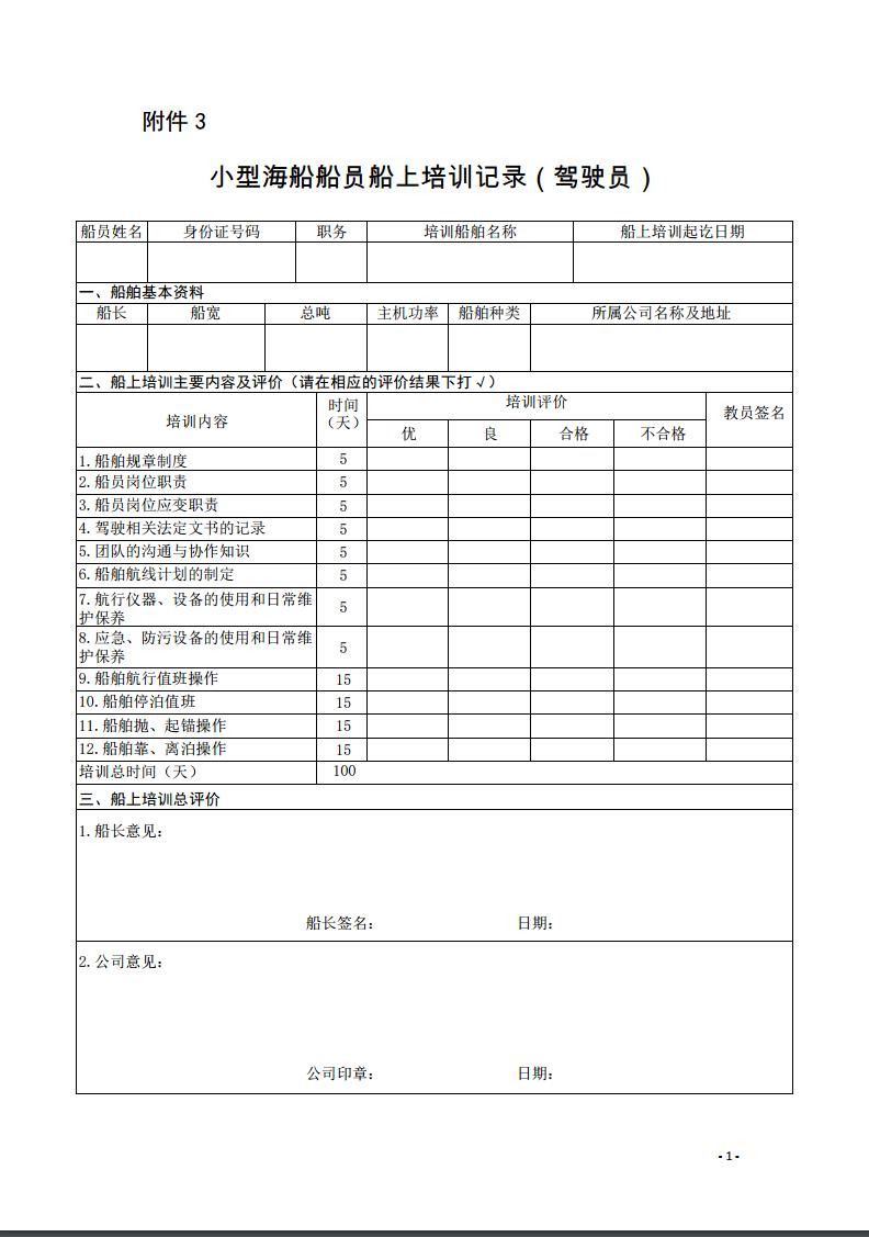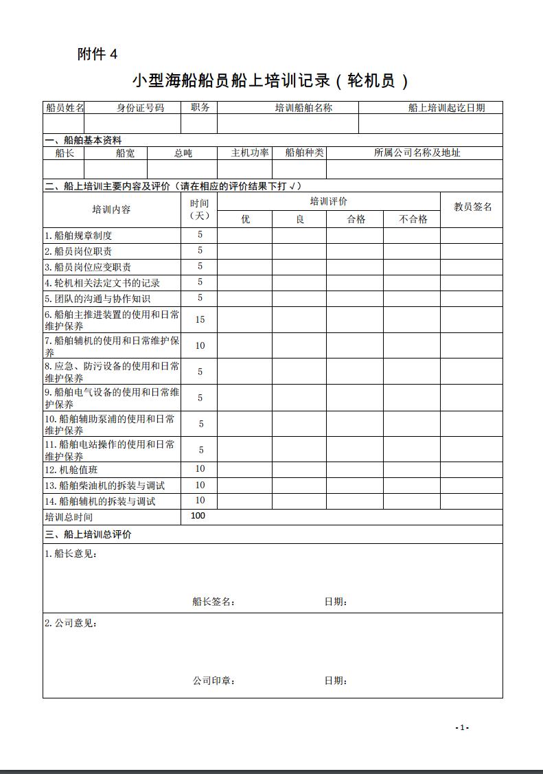 (九)小型海船船员船上培训记录(附件3、附件4);