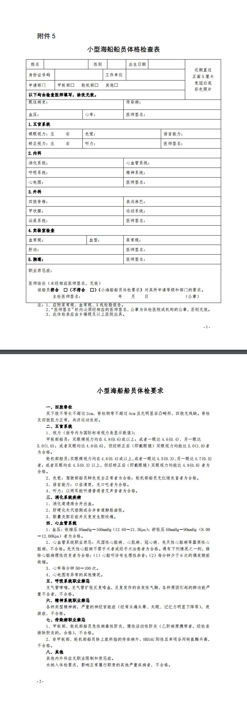 (三)小型海船船员体格检查表(附件5)或“海船船员健康证明”;