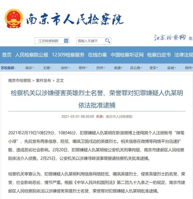 报道称,2021年2月19日,犯罪嫌疑人仇某明在新浪微博上使用其个人注册账号“辣笔小球”先后发布两条信息,贬低、嘲讽卫国戍边的英雄烈士。相关信息在微博等网络平台迅速扩散,造成恶劣社会影响。2月20日,犯罪嫌疑人仇某明被公安机关刑事拘留,南京市建邺区人民检察院依法介入侦查。2月25日,公安机关以涉嫌寻衅滋事罪提请检察机关批准逮捕。