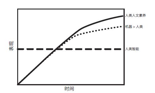 随着机器变得越来越智能,人类需要沿着一条不同于机器的道路进化,以便变得更加人性化。在图13-1中,我试图描述这一点。随着时间的推移,人类的表现不太可能发生实质性的改变。而在各种细分任务上,机器将逐步超越人类。为了将人类带入一个新的高度,我们需要提高人文素养,而这始终是人类与机器的根本差异所在。值得注意的是,尽管人们一直在努力设计各种能提升共情能力的社交机器人或应用程序,但人类的共情能力并不是机器能够真正模拟的。一些试图探测愤怒、悲伤、疲劳和分心等人类情绪的人工智能应用正在研发中。由最先进的机器人公司研制的虚拟人已经被内置了共情能力,但参与研发的人工智能专家也承认其有所不足,因为还无法“使这样的机器充满人性”,日本人称之为“存在感”(sonzai-kan)。会共情只是人类的基本特征之一,我们还需要爱、笑、哭、梦想、害怕、悲伤、喜悦、相互信任、相互关心、受苦、探索、讲故事、启发、好奇、创造力、感恩、乐观、善良、表达情感、理解、慷慨和尊重等,并且还需要适应能力、创新力、直觉、常识、文化、抽象化和语境化的能力,以及灵魂等。