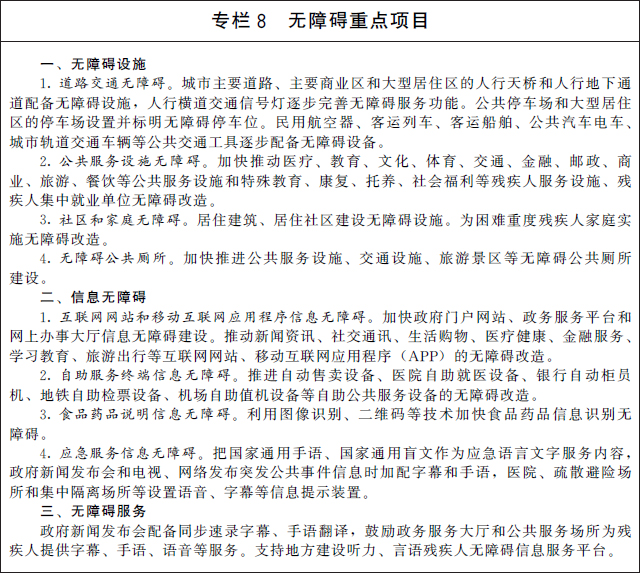 4.加快发展信息无障碍。将信息无障碍作为数字社会、数字政府、智慧城市建设的重要组成部分,纳入文明城市测评指标。推广便利普惠的电信服务,加快政府政务、公共服务、电子商务、电子导航等信息无障碍建设,加快普及互联网网站、移动互联网应用程序和自助公共服务设备无障碍。推进智能化服务要适应残疾人需求,智能工具应当便于残疾人日常生活使用。促进信息无障碍国家标准推广应用,加强对互联网内容可访问性的测试、认证能力建设,开展互联网和移动互联网无障碍化评级评价。支持研发生产科技水平高、性价比优的信息无障碍终端产品。