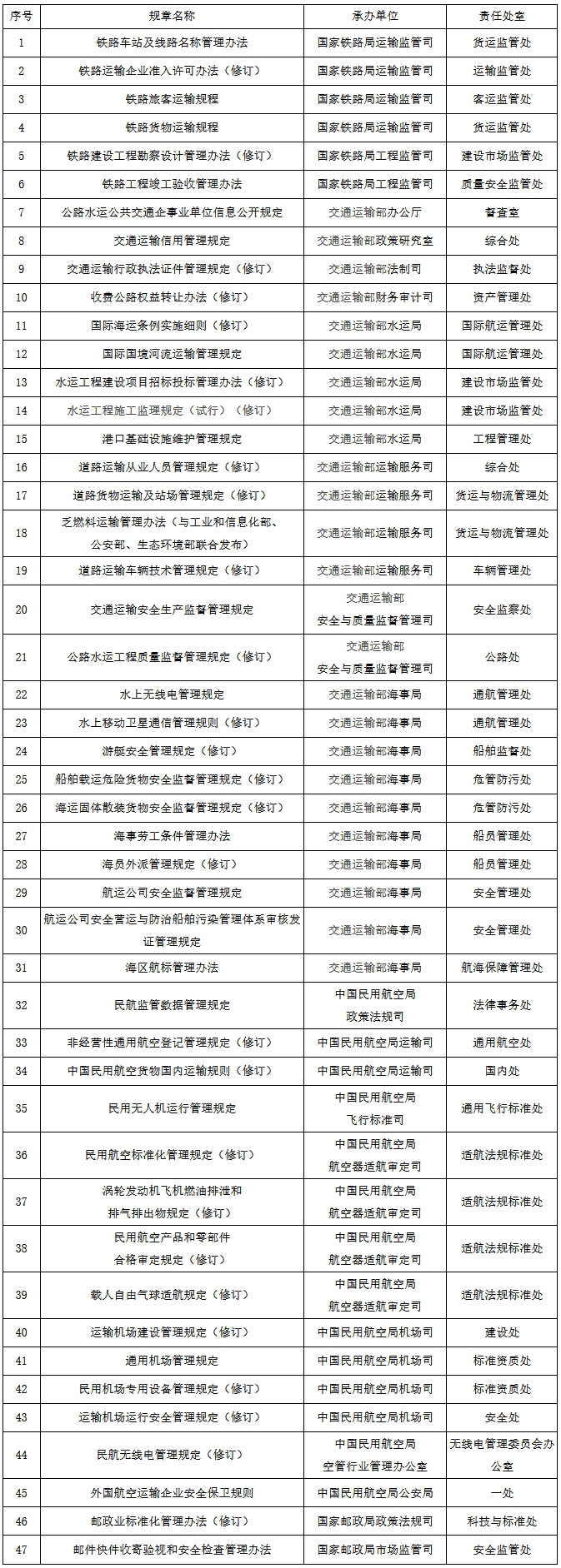 1.交通运输法:综合规划司负责起草,国家铁路局、中国民用航空局、国家邮政局和部内相关司局参加。