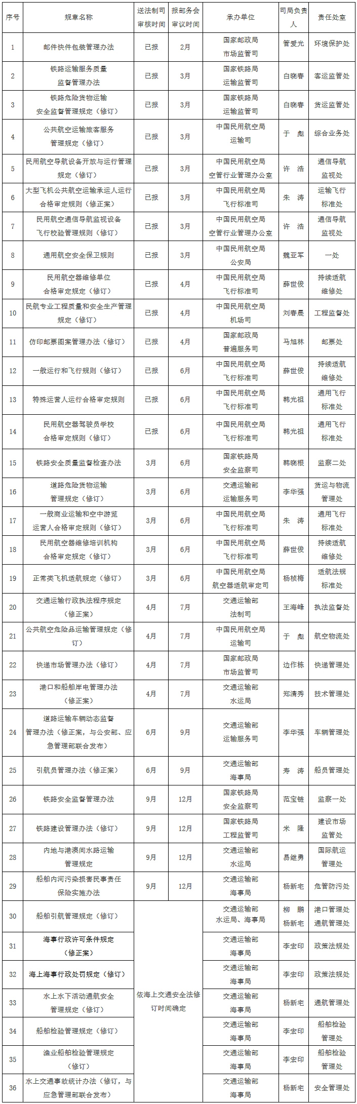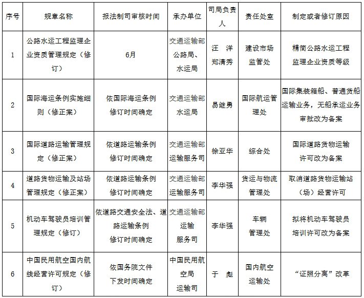 10.道路运输条例(修订):法制司会同运输服务司,报送国务院后配合司法部开展审核修改工作。
