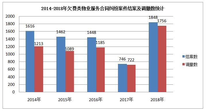 2014年至2018年欠费类的物业服务合同纠纷案件结案数依次为1,616件、1,462件、1,448件、746件、1,848件(见图3),调撤率较高,依次为75.07%、74.48%、81.84%、96.78%、95.02%(见图4),调撤率不断提升且均属高位。