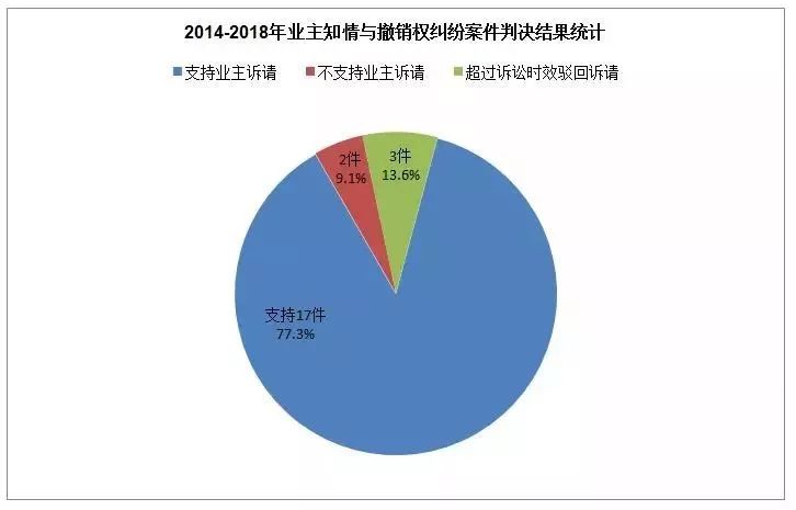 2014年至2018年的业主知情权与撤销权纠纷案件共计40件,其中判决22件、撤诉18件。在判决结案的22件案件中,法院明确支持业主诉请的17件、不支持的2件、因超过诉讼时效驳回业主诉请的3件。(见图5)。