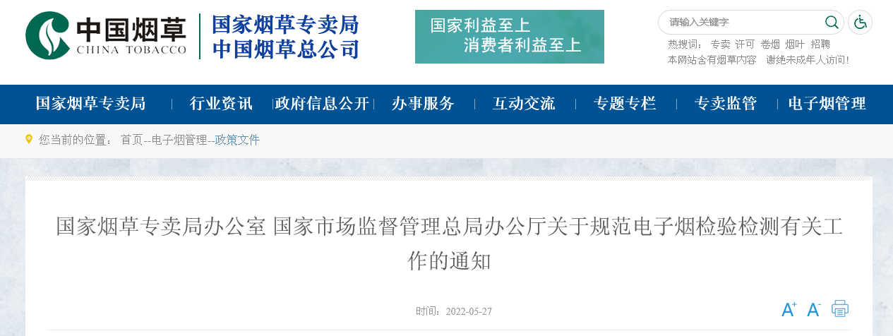 为进一步加强电子烟监管,保障电子烟产品质量安全,规范电子烟检验检测有关工作,根据《中华人民共和国烟草专卖法》及其实施条例、《中华人民共和国产品质量法》等相关规定,现就规范电子烟检验检测有关工作通知如下: