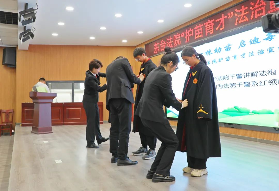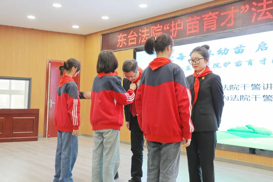 法院干警向同学们讲解法袍的组成和含义,并现场为同学们穿上法袍,带领同学们沉浸式体验“小法官”的担当。同学们也为干警们佩戴了红领巾。
