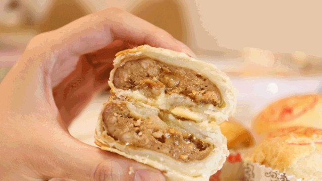 与寻常能见到的小月饼不同,桥墩月饼大而厚实。看似毫不华丽的外表下,藏着的是那“儿时外婆送来的”踏实老味道。撕开包装袋,芝麻香便扑鼻而来,裹满芝麻外衣的外皮酥脆无比,轻轻一掰便露出满满的肉馅儿、花生、红枣、瓜子仁、蛋黄……用料超级足!